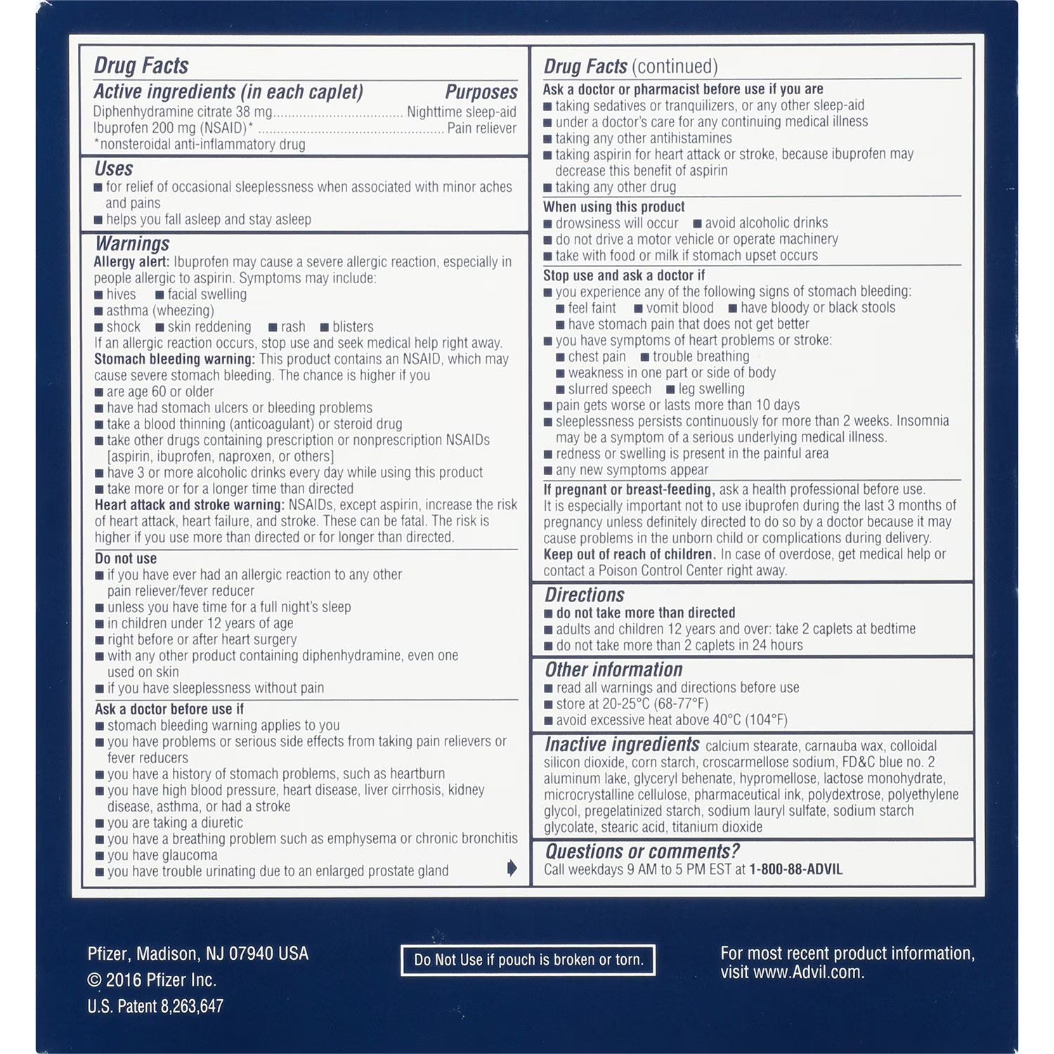 Advil PM is the only brand offering an exclusive bi-layer patented formula. Each caplet combines the #1 pain reliever (Ibuprofen) with the #1 soothing sleep aid (Diphenhydramine) that helps you relieve pain and fall asleep.