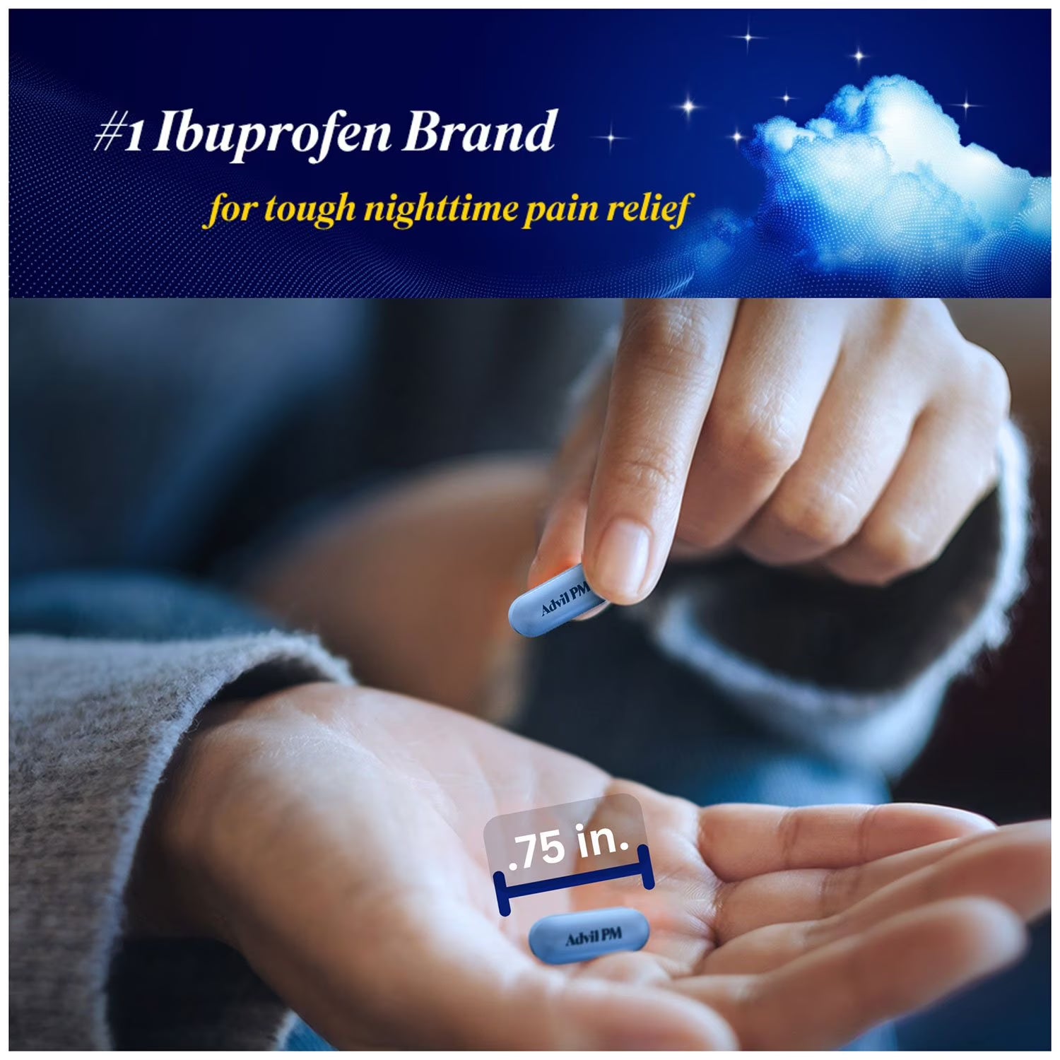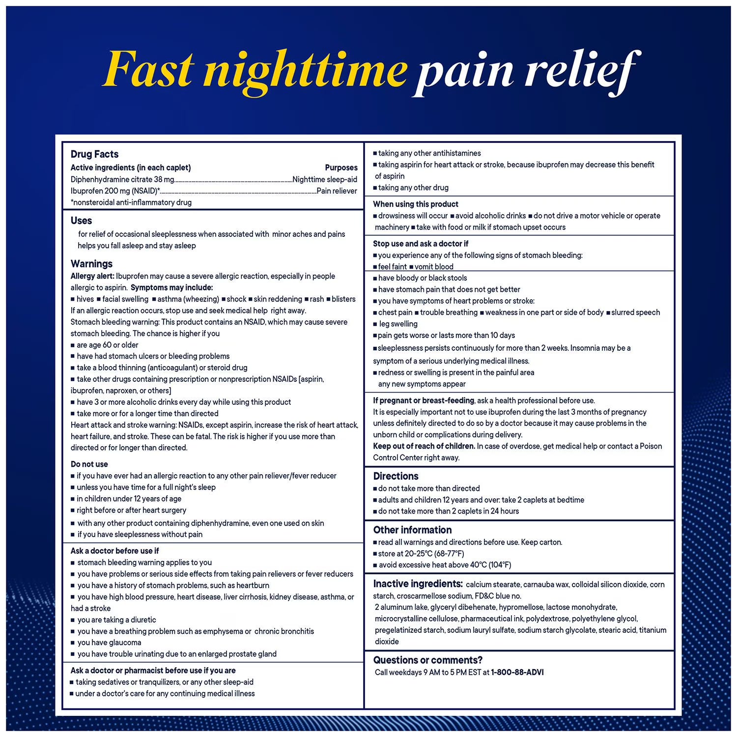 Advil PM Pain Reliever and Nighttime Sleep Aid combines the #1 ibuprofen brand plus the #1 sleep ingredient to give you fast pain relief and a whole night's sleep.(1) Whether you have occasional muscle aches, a backache, a toothache or minor arthritis pain, these non-habit forming Advil caplets help relieve occasional sleeplessness associated with minor aches and pains. Each caplet contains ibuprofen 200mg, a minor arthritis relief, headache relief and joint pain relief medication that relieves pain at the site of inflammation. This pain PM medicine also contains diphenhydramine citrate 38mg, a nighttime sleep aid that helps you fall asleep and stay asleep. Advil PM pain relievers come in a convenient caplet form that is easily portable, so you can get a good night's sleep whether you're at home or away. Advil PM gives you the restful sleep you need, helping you fall asleep and stay asleep so your body can heal as you rest. Advil PM. For a healing night's sleep.