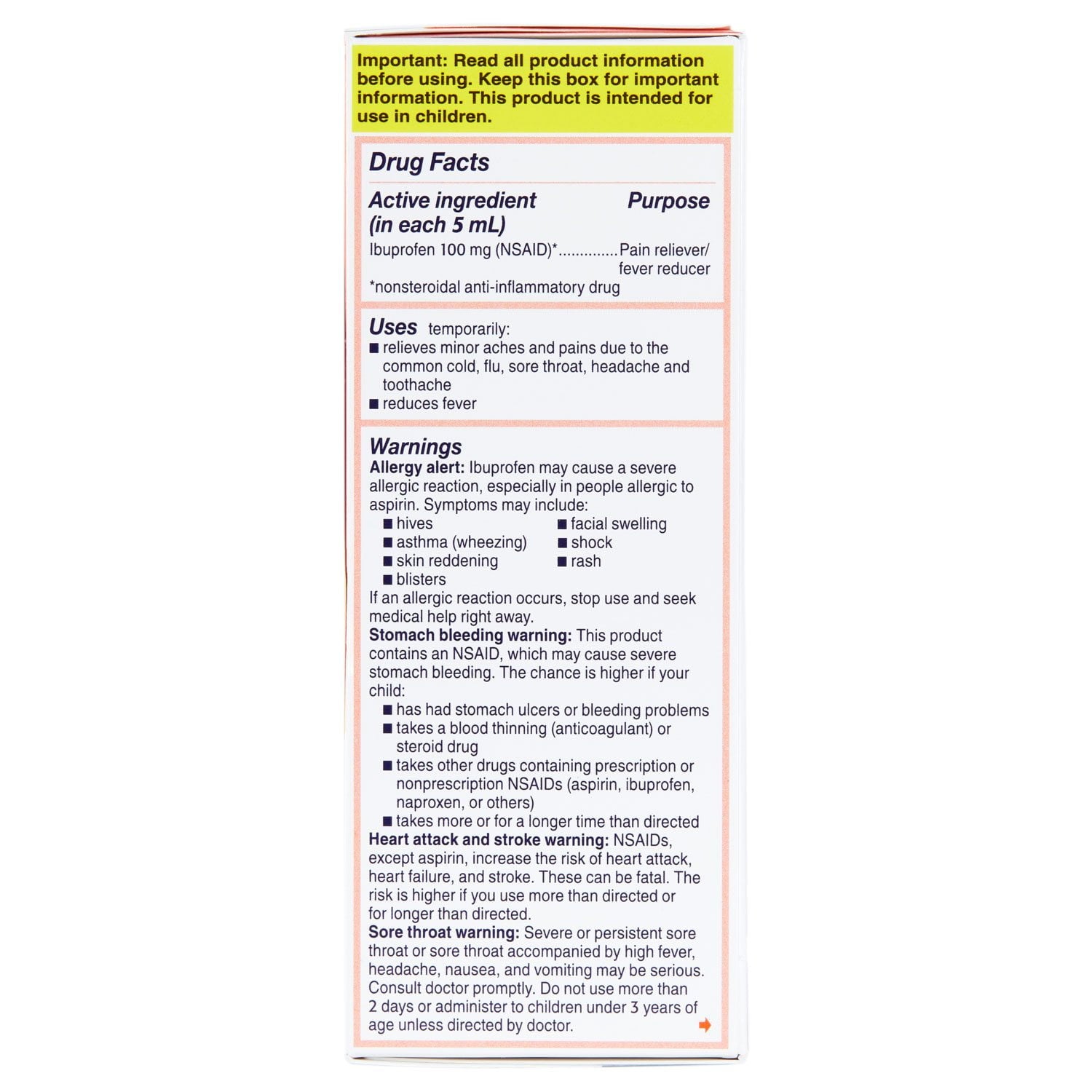 Heart attack and stroke warning: NSAIDs, except aspirin, increase the risk of heart attack, heart failure, and stroke. These can be fatal. The risk is higher if you use more than directed or for longer than directed. Sore throat warning: Severe or persistent sore throat or sore throat accompanied by high fever, headache, nausea, and vomiting may be serious. Consult doctor promptly. Do not use more than 2 days or administer to children under 3 years of age unless directed by doctor. Do not use: if the child has ever had an allergic reaction to any other pain reliever/fever reducer, right before or after heart surgery. Ask a doctor before use if: stomach bleeding warning applies to your child, child has a history of stomach problems such as heartburn, child has problems or serious side effects from taking pain relievers or fever reducers, child has not been drinking fluids, child has lost a lot of fluid due to vomiting or diarrhea, child has high blood pressure, heart disease, liver cirrhosis, kidney disease, or had a stroke, child has asthma, child is taking a diuretic. Ask a doctor or pharmacist before use if the child is: under a doctor’s care for any serious condition or taking any other drug. When using this product: take with food or milk if stomach upset occurs. The risk of heart attack or stroke may increase if you use more than directed or for longer than directed. Stop use and ask a doctor if: child experiences any of the following signs of stomach bleeding, feels faint, vomits blood, has bloody or black stools, has stomach pain that does not get better, child has symptoms of heart problems or stroke: chest pain, trouble breathing, weakness in one part or side of body, slurred speech, leg swelling, the child does not get any relief within first day (24 hours) of treatment, fever or pain gets worse or lasts more than 3 days, redness or swelling is present in the painful area, or if any new symptoms appear. Keep out of reach of children. In case of overdose get medical help or contact a Poison Control Center right away. (1-800-222-1222). -