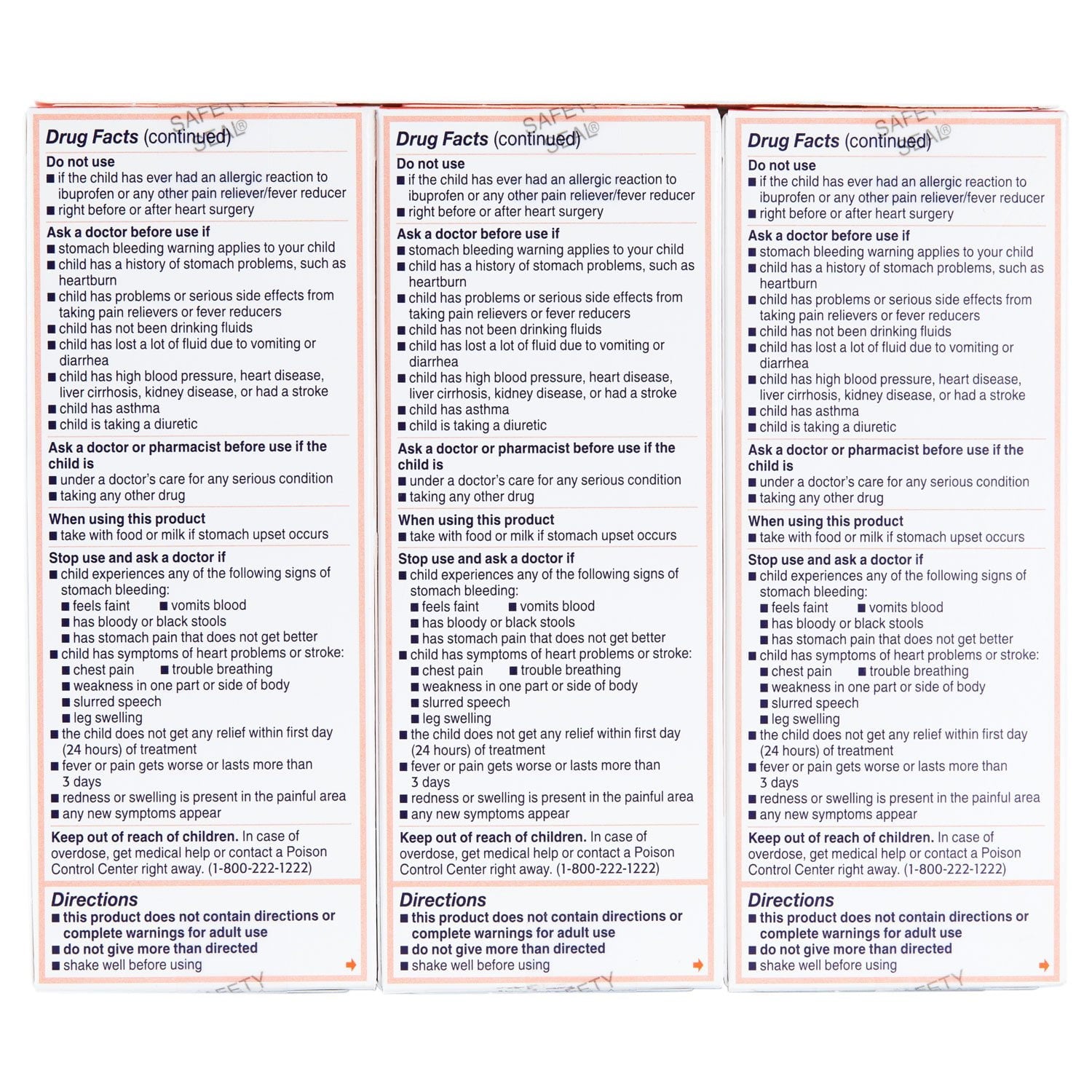 Allergen + Warnings information: Allergy alert: Ibuprofen may cause a severe allergic reaction, especially in people allergic to aspirin. Symptoms may include: hives, facial swelling, asthma (wheezing), shock, skin reddening, rash, blisters. If an allergic reaction occurs, stop use and seek medical help right away. Stomach bleeding warning: This product contains an NSAID, which may cause severe stomach bleeding. The chance is higher if your child: has had stomach ulcers or bleeding problems, takes a blood thinning (anticoagulant) or steroid drug, takes other drugs containing prescription or nonprescription NSAIDs(aspirin, ibuprofen, naproxen, or others), takes more or for a longer time than directed.