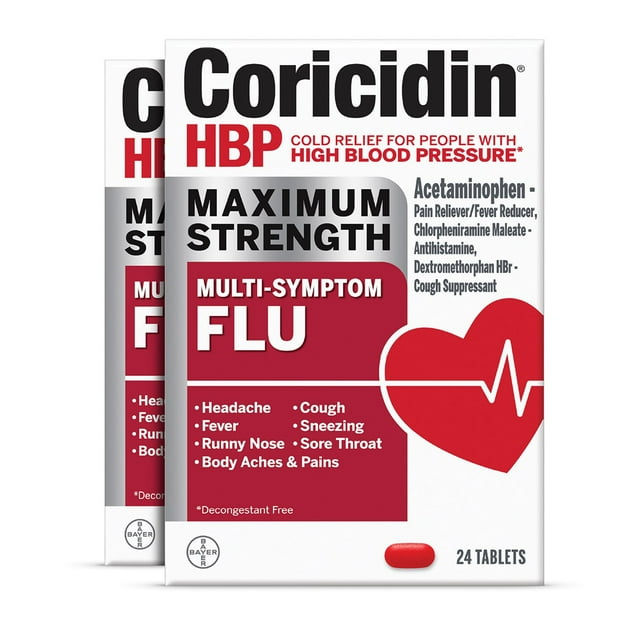 Coricidin HBP Cough and Cold Tablets are a cold medicine for adults with high blood pressure that delivers decongestant-free, powerful cold and flu relief without raising your blood pressure. Each dose of this powerful cough, cold, and flu medicine for adults contains the cough suppressant dextromethorphan to quiet coughs, along with an antihistamine for runny nose relief. Together, these two medications work to control cough, cold, and flue symptoms, including runny nose, sneezing and cough, without elevating your blood pressure.