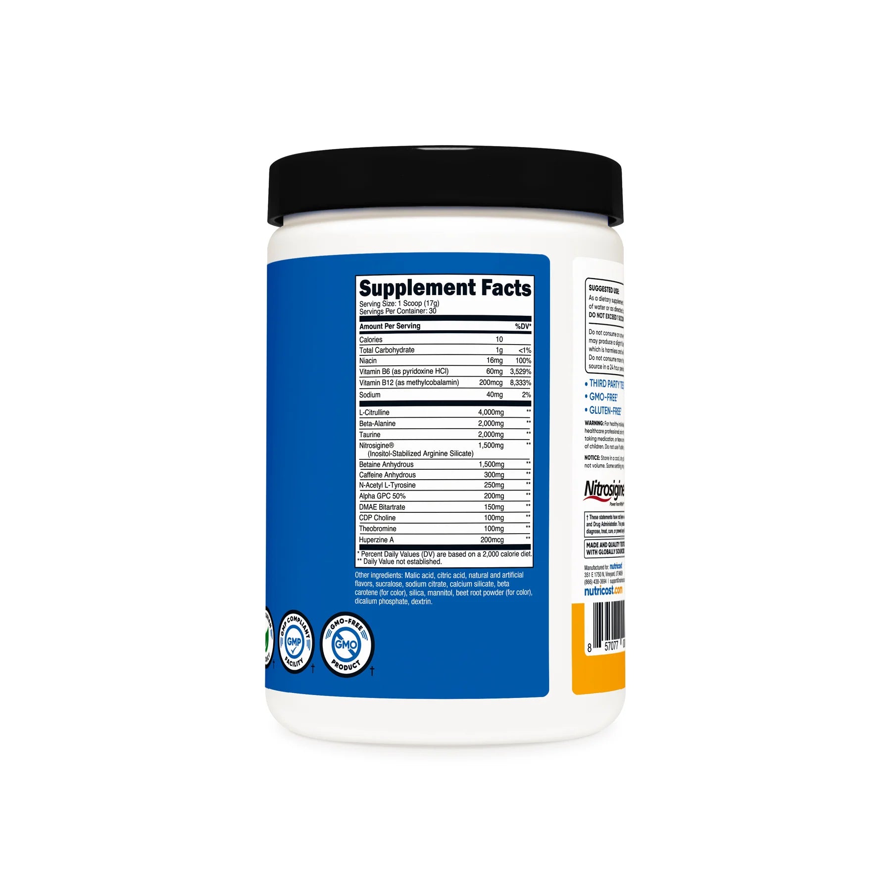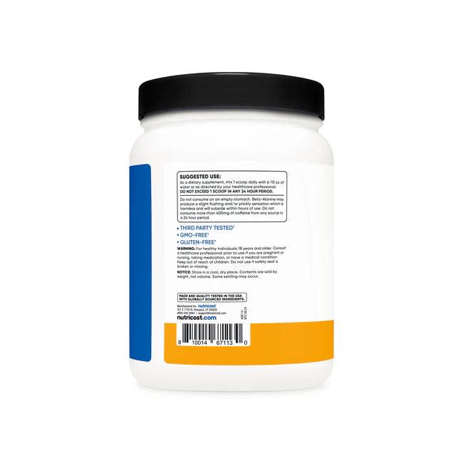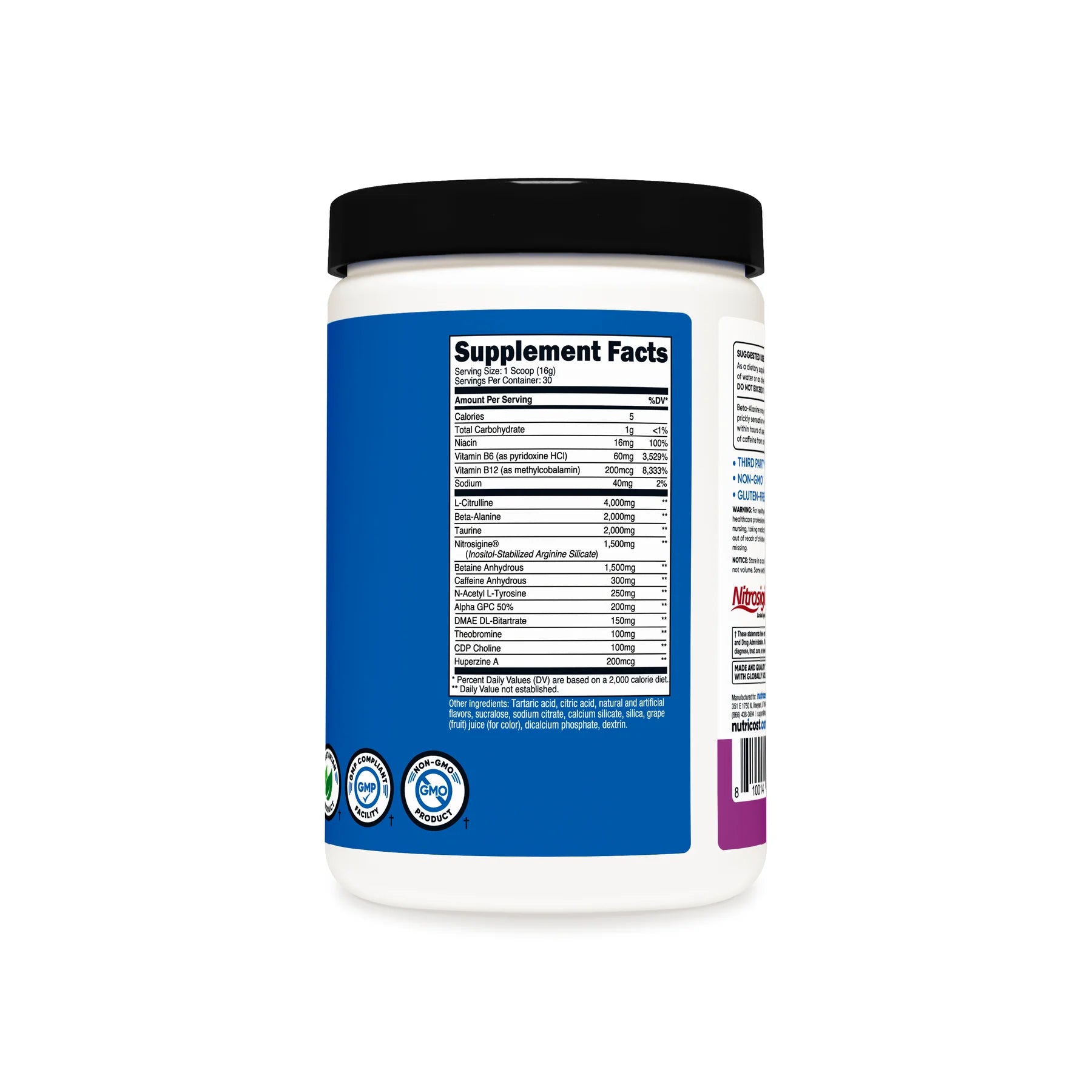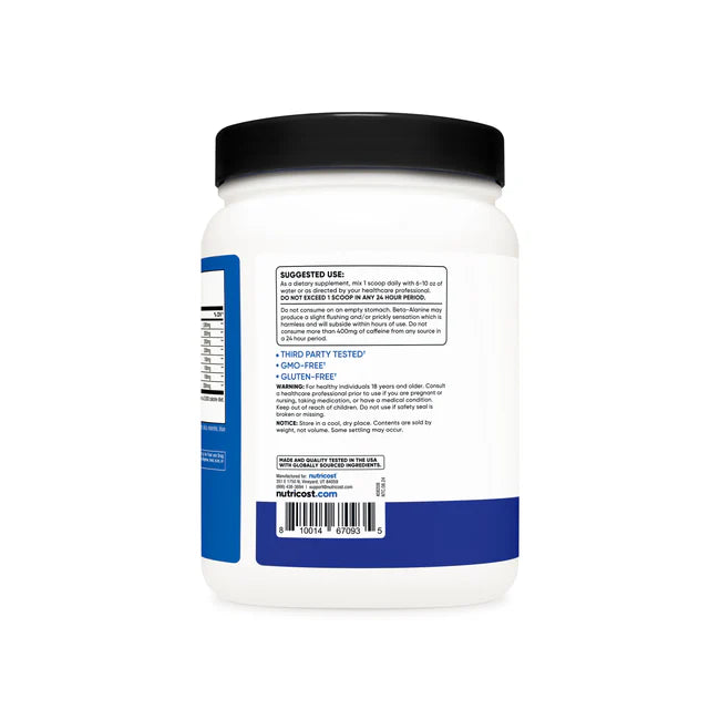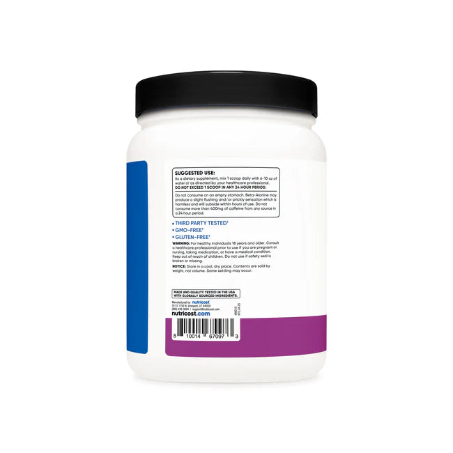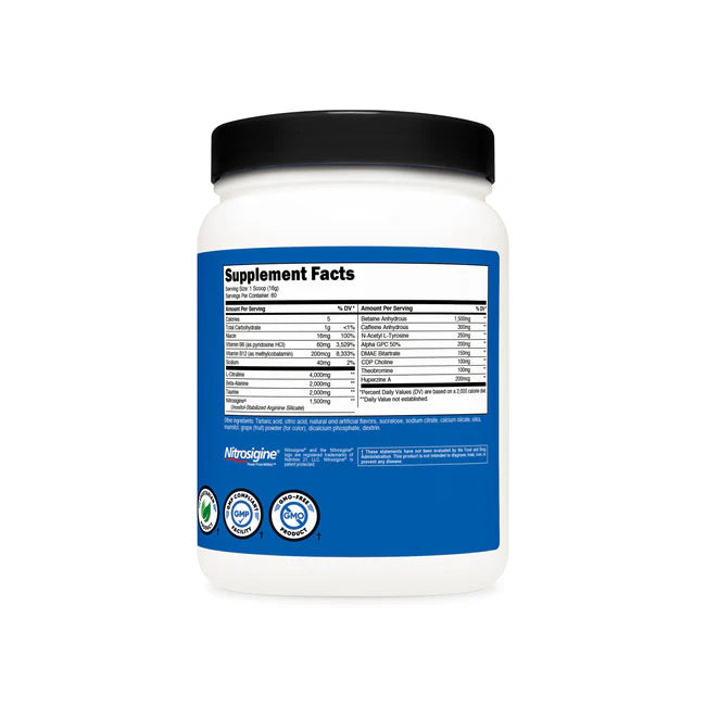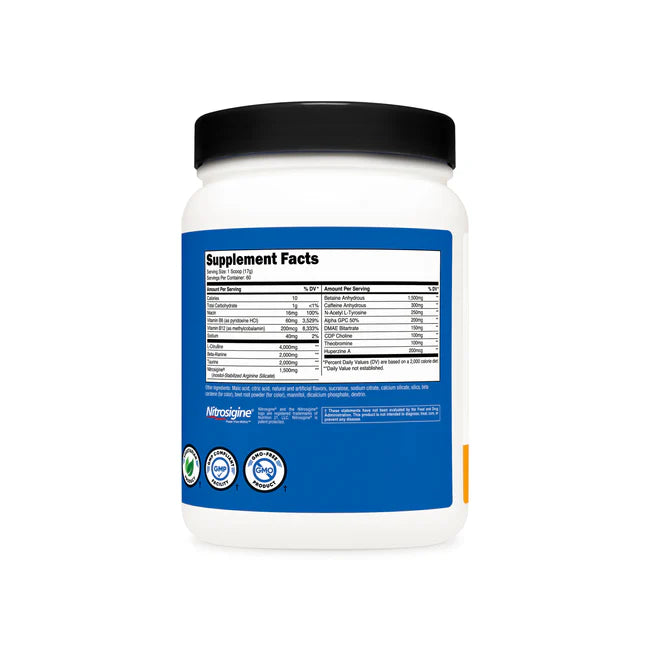 - Nutricost Pre-Workout Powder Contains L-Citrulline, Beta Alanine, Taurine, Nitrosigine, Caffeine Anhydrous, Theobromine, Huperzine A, Niacin, Vitamin B6, and Vitamin B12