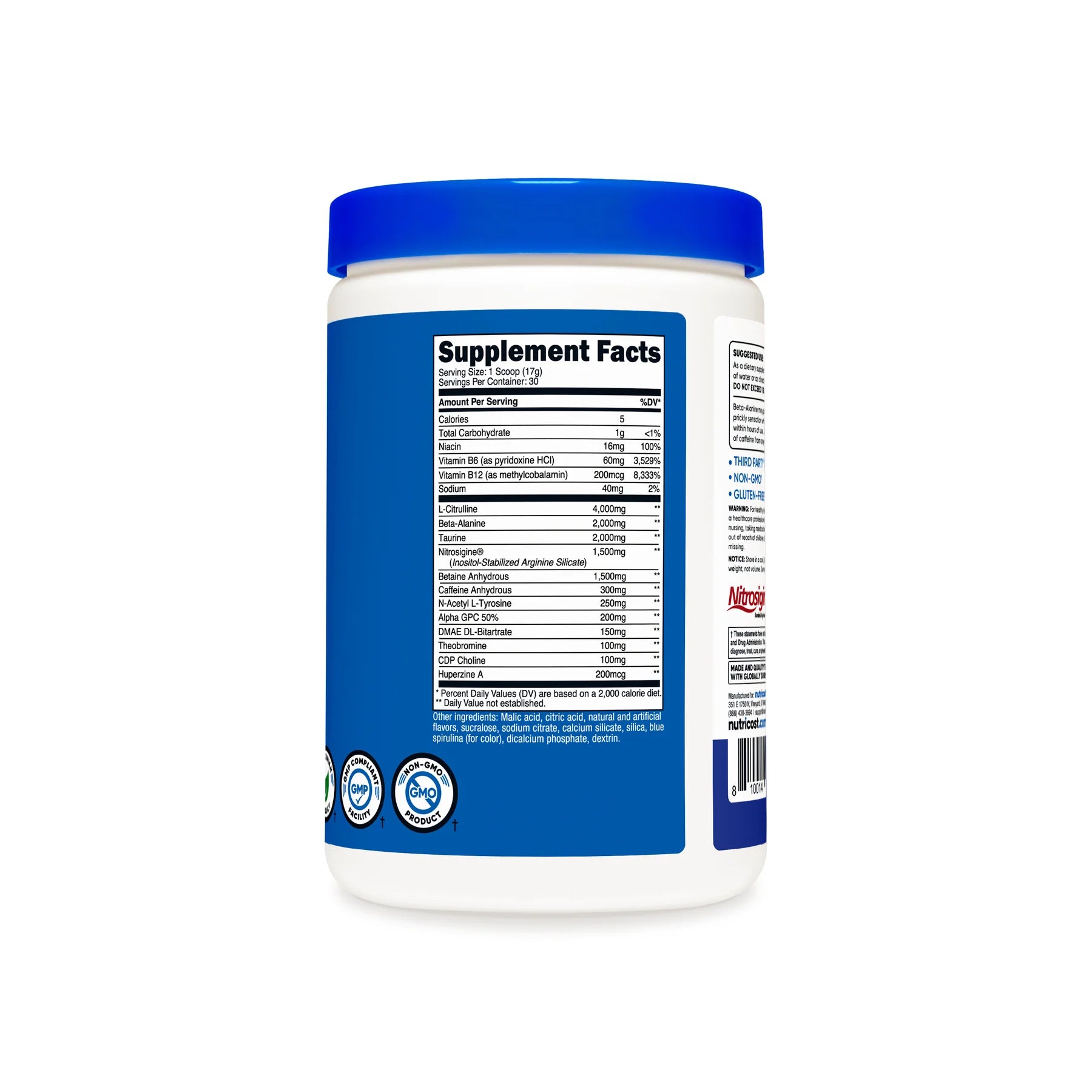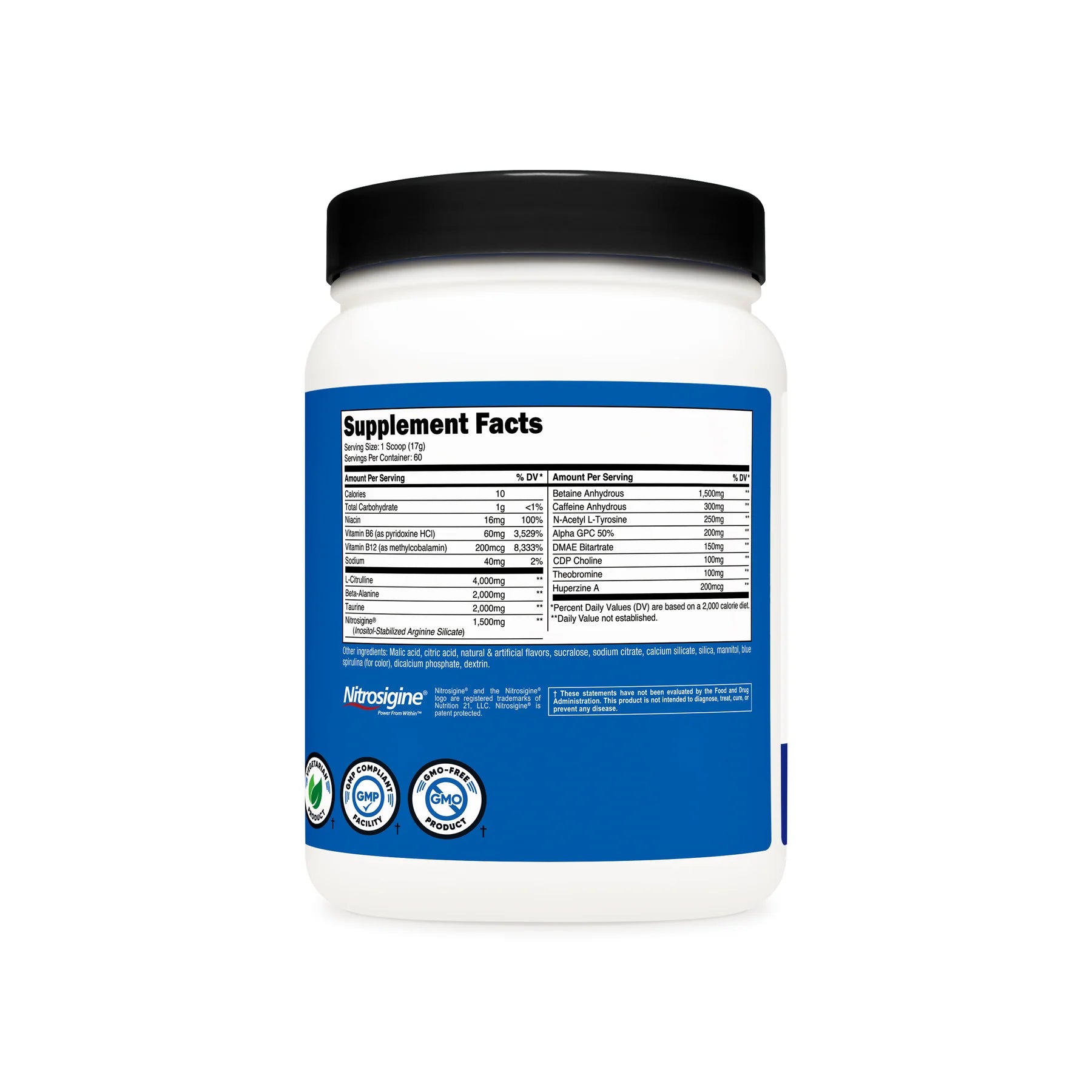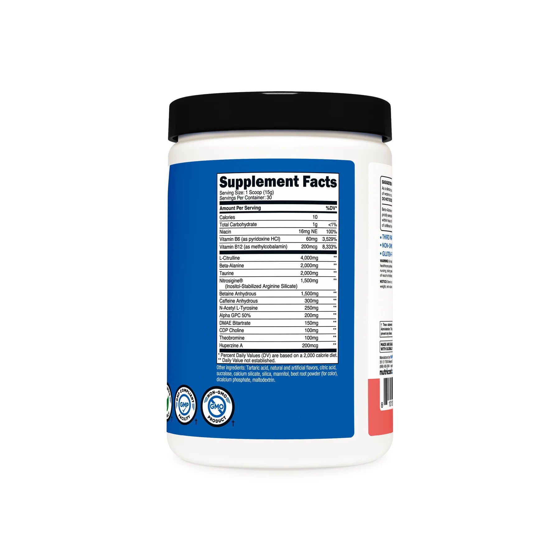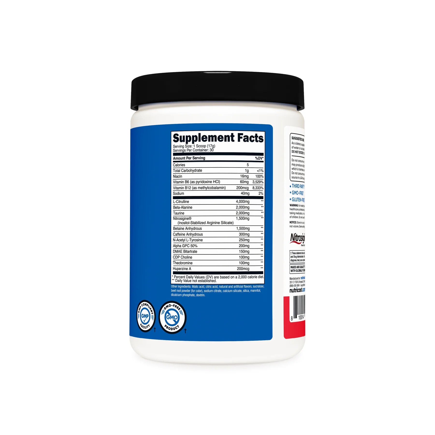 - Nutricost Pre-Workout Powder Contains L-Citrulline, Beta Alanine, Taurine, Nitrosigine, Caffeine Anhydrous, Theobromine, Huperzine A, Niacin, Vitamin B6, and Vitamin B12