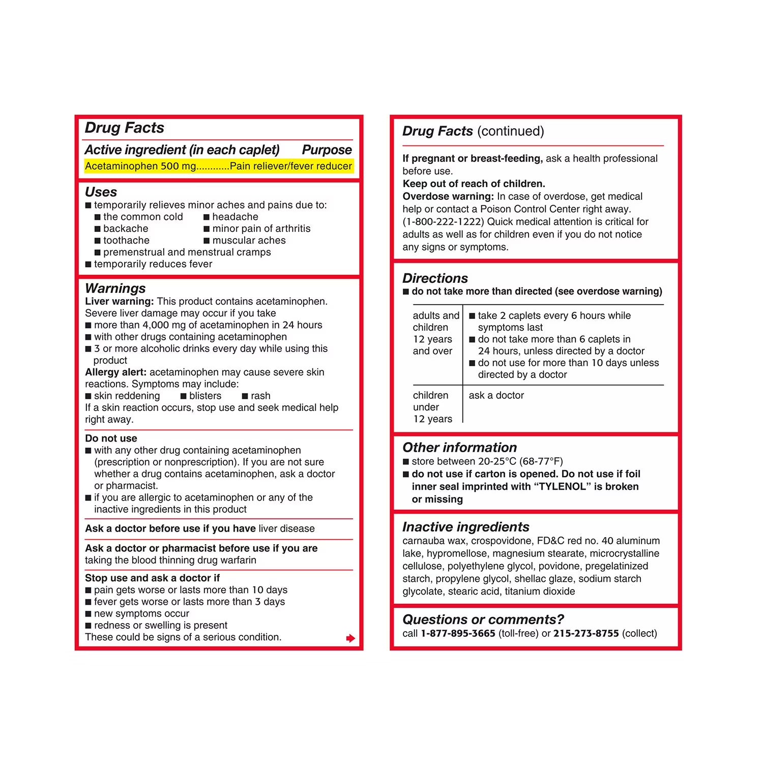Tylenol Extra Strength Pain Relief Caplets temporarily reduce fever and relieve minor aches and pains. Each 500 mg acetaminophen pain relief tablet provides strong, fast acting pain relief from headache, backache, toothache, muscle aches, minor arthritis pain, the common cold, and menstrual or premenstrual cramps. From the #1 doctor-recommended brand for pain relief and fever reduction, these extra-strength 500 mg acetaminophen caplets offer an excellent safety profile when used as directed. This powerful pain relief medicine is a great option for pain and fever relief. Indicated for adults and children aged 12 and older, this fever reducer and pain medicine delivers trusted, effective relief when used as directed. Adults and children 12 years and over, take two caplets every six hours while symptoms last. Do not take more than six extra strength acetaminophen caplets in 24-hours unless directed by a doctor.