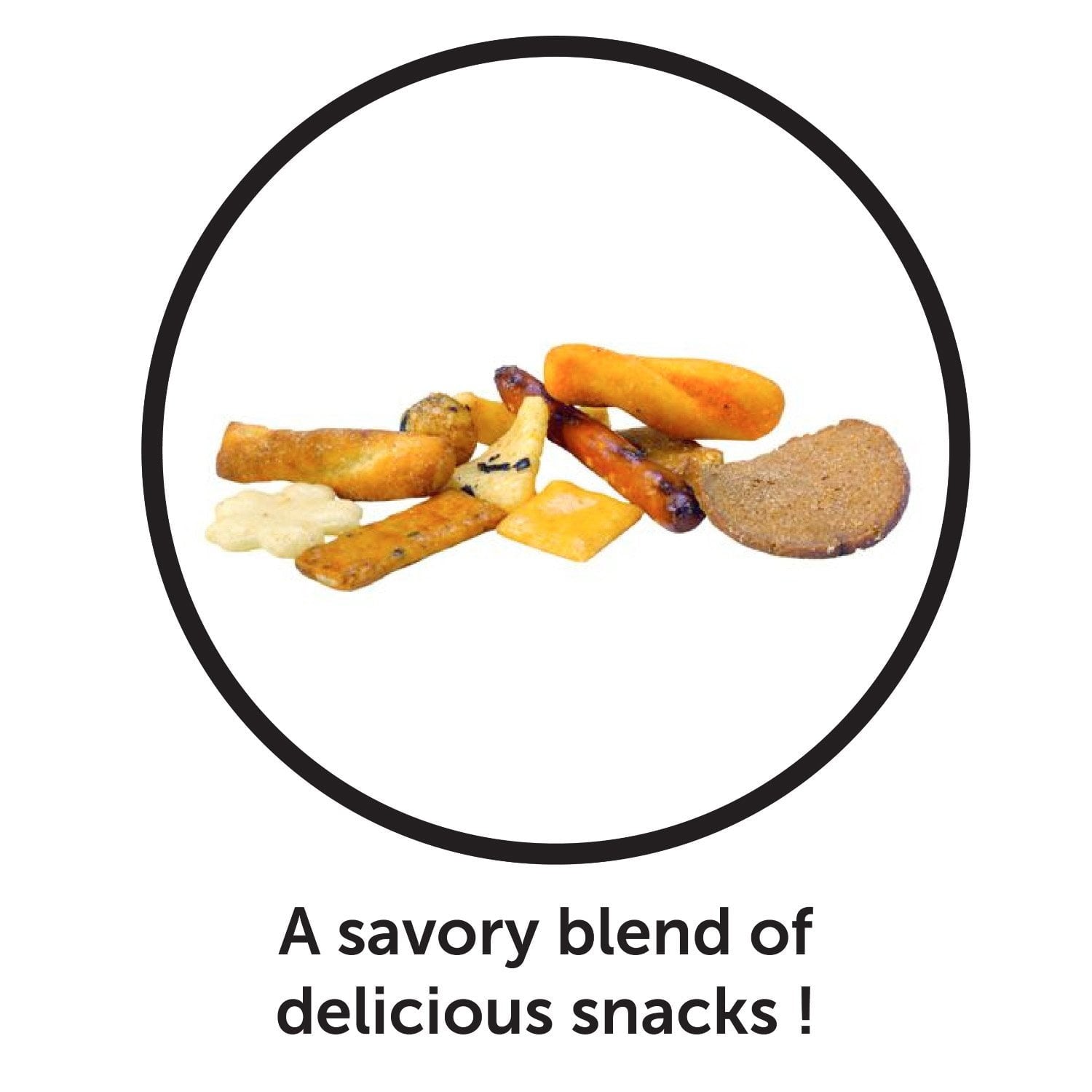 Ingredients: Pretzel Sticks, Oriental Rice Crackers, Naturally & Artificially Honey Mustard Flavored Breadsticks, Naturally & Artificially Cheese Flavored Crunchies, Honey Roasted Sesame Chips, Naturally & Artificially Nacho Flavored Bagel Chips, Worcestershire Rye Bagel Chips. Enriched Wheat Flour [Wheat Flour, Malted Barley Flour, Niacin (Vitamin B3), Reduced Iron, Thiamine Mononitrate (Vitamin B1), Riboflavin (Vitamin B2), Folic Acid], Wheat Flour, Rice, Vegetable Oil (Contains One Or More Of The Following: Corn Oil, Canola Oil, Palm Oil, Cottonseed Oil, Soybean Oil, Sunflower Oil And/Or Safflower Oil), Degerminated Corn Meal, Rye Flour, Salt, Sesame Seeds, Sugar, Soy Sauce (Water, Soybeans, Salt), Whey, Honey Coating (Sugar, Wheat Starch, Honey), Yeast (Yeast, Yeast Extract, Sorbitan Monostearate, Ascorbic Acid), Maltodextrin, Bulgur Wheat, Wheat Gluten, Dextrose, Malt Syrup (Derived From Corn And Malted Barley), Malt Powder (Enriched Wheat Flour, Dextrose, Malted Barley Flour), Semisoft Cheese (Milk, Cheese Culture, Salt, Enzymes), Whey Protein Concentrate, Honey Powder (Honey, Maltodextrin), Mustard Powder [Dehydrated Mustard (Distilled Vinegar, Mustard Seed, Salt, Turmeric, Paprika, Spice, Natural Flavor, Garlic Powder), Maltodextrin, Modified Corn Starch, Natural Flavor], Caraway Seeds, Worcestershire Sauce Powder (Molasses, Vinegar, Corn Syrup, Caramel Color, Garlic, Spices, Tamarind, Natural Flavor, Maltodextrin), Natural Flavors, Buttermilk Solids, Cheddar Cheese (Milk, Cheese Culture, Salt, Enzymes), Milkfat, Onion Powder, Garlic Powder, Tomato Powder, Spices, Chili Powder, Seaweed, Citric Acid, Lactic Acid, Sodium Phosphate, Yellow 6, Yellow 5, Yellow 5 Lake, Yellow 6 Lake, Tack Blend (Maltodextrin, Xanthan Gum), Turmeric (Color), Butter (Cream, Salt), Autolyzed Yeast Extract, Calcium Sulfate, Oleoresin Paprika, Beet Powder (Color), Artificial Flavor, Disodium Inosinate And Disodium Guanylate, L-Cysteine, Enzymes, Baking Soda.